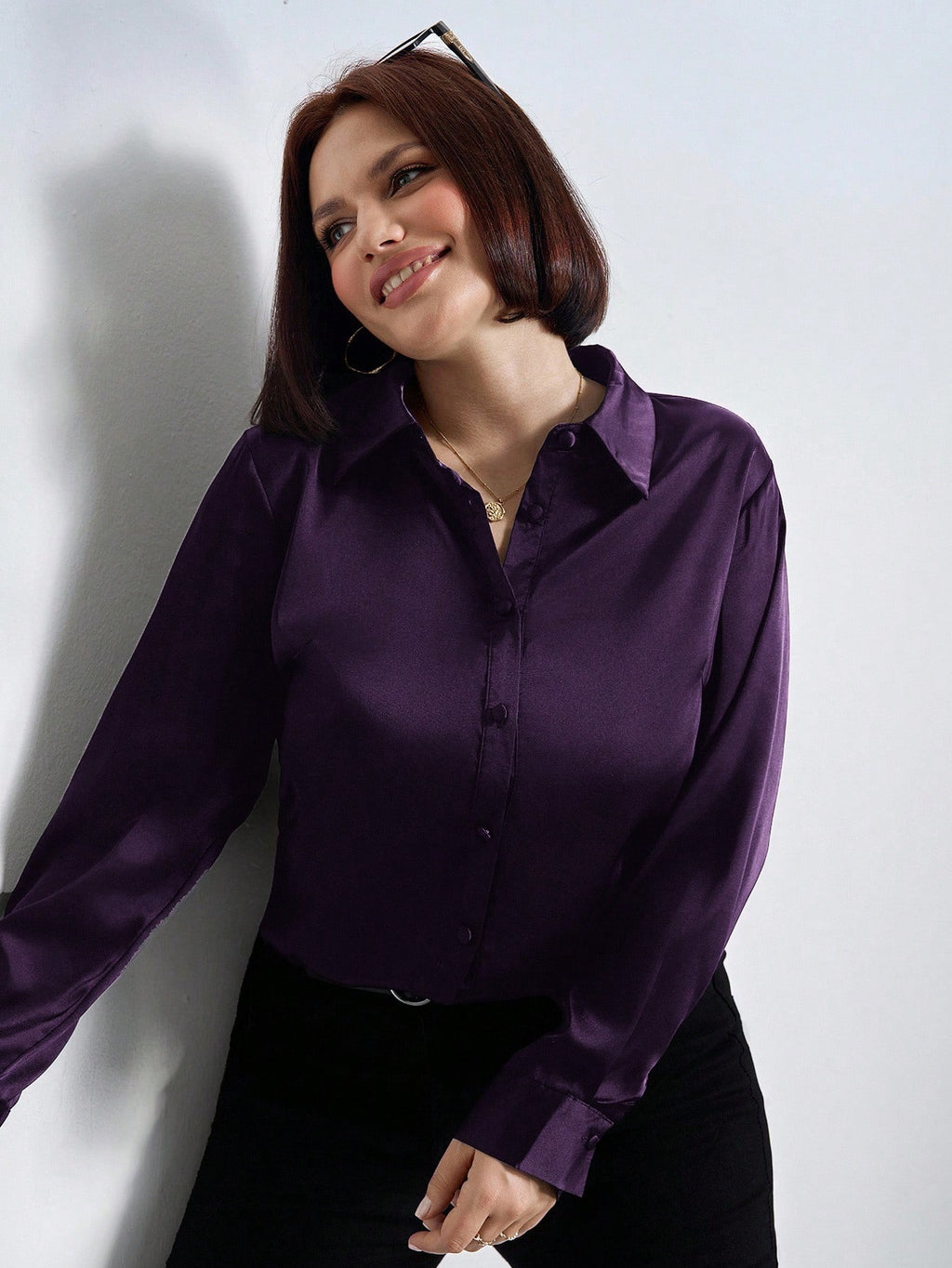 A Camisa de Cetim Roxa Plus Size da Nelima Moda é a escolha ideal para mulheres que desejam unir sofisticação e conforto em um só look. Feita em cetim de brilho acetinado, oferece toque suave e caimento perfeito, valorizando cada curva com elegância.