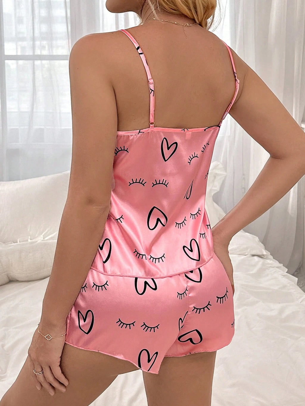 CONJUNTO DE PIJAMA EM CETIM COM ESTAMPA DE CÍLIOS E CORAÇÕES – SHORT E REGATA | NELIMA MODA