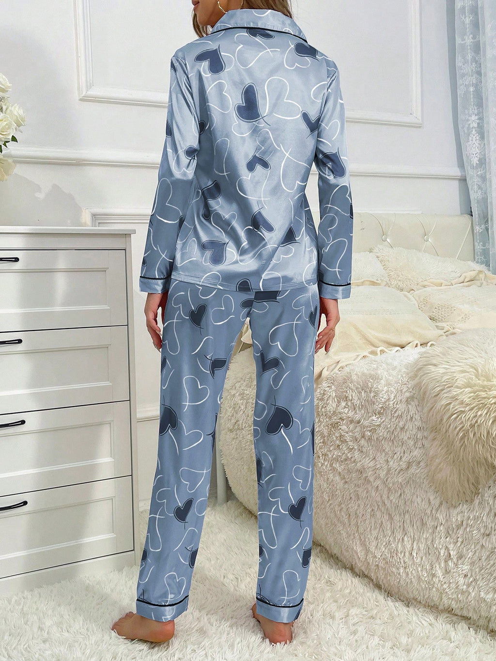 Pijama Feminino de Cetim Azul com Estampa de Corações – Conforto e Elegância