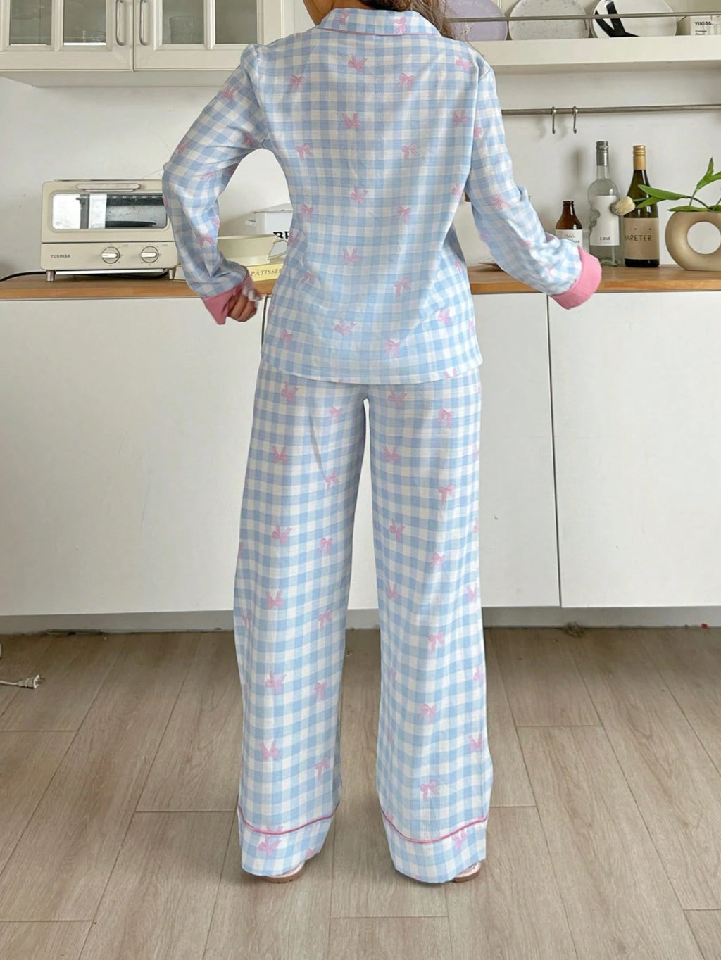 Durma e relaxe com todo o conforto que você merece com o Pijama Xadrez Feminino de Algodão. Com modelagem moderna e delicada estampa de laços rosa sobre o clássico xadrez azul e branco, ele é perfeito para unir aconchego e estilo.