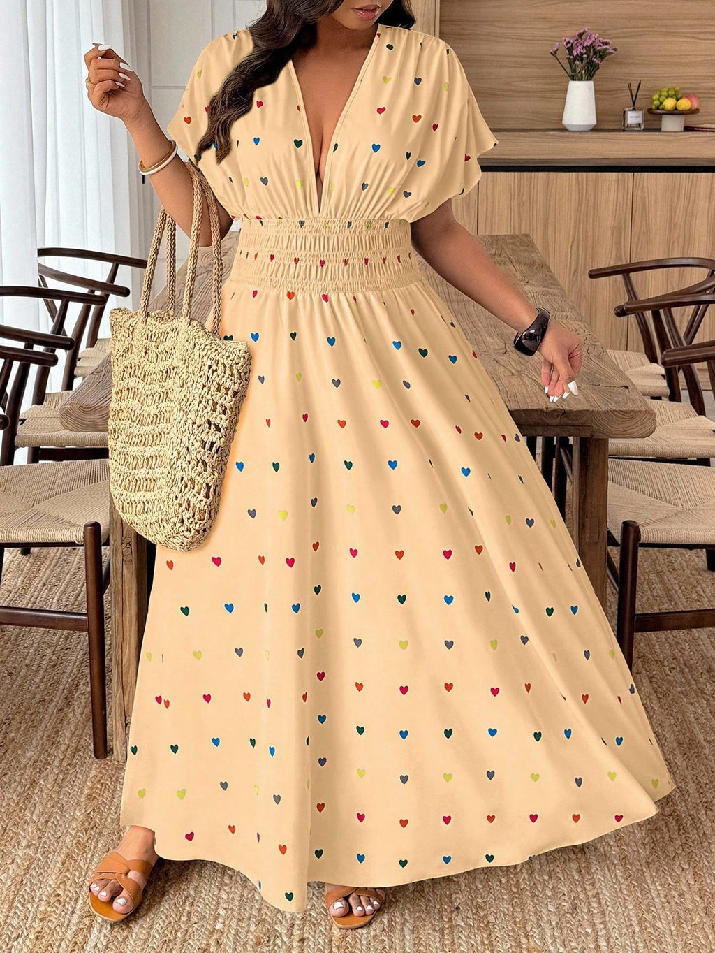 Vestido Longo Feminino Plus Size Bege com Estampa de Corações – Toque Suave e Feminino | Nelima