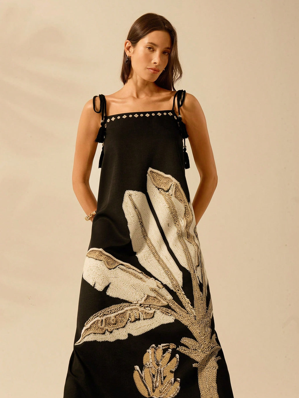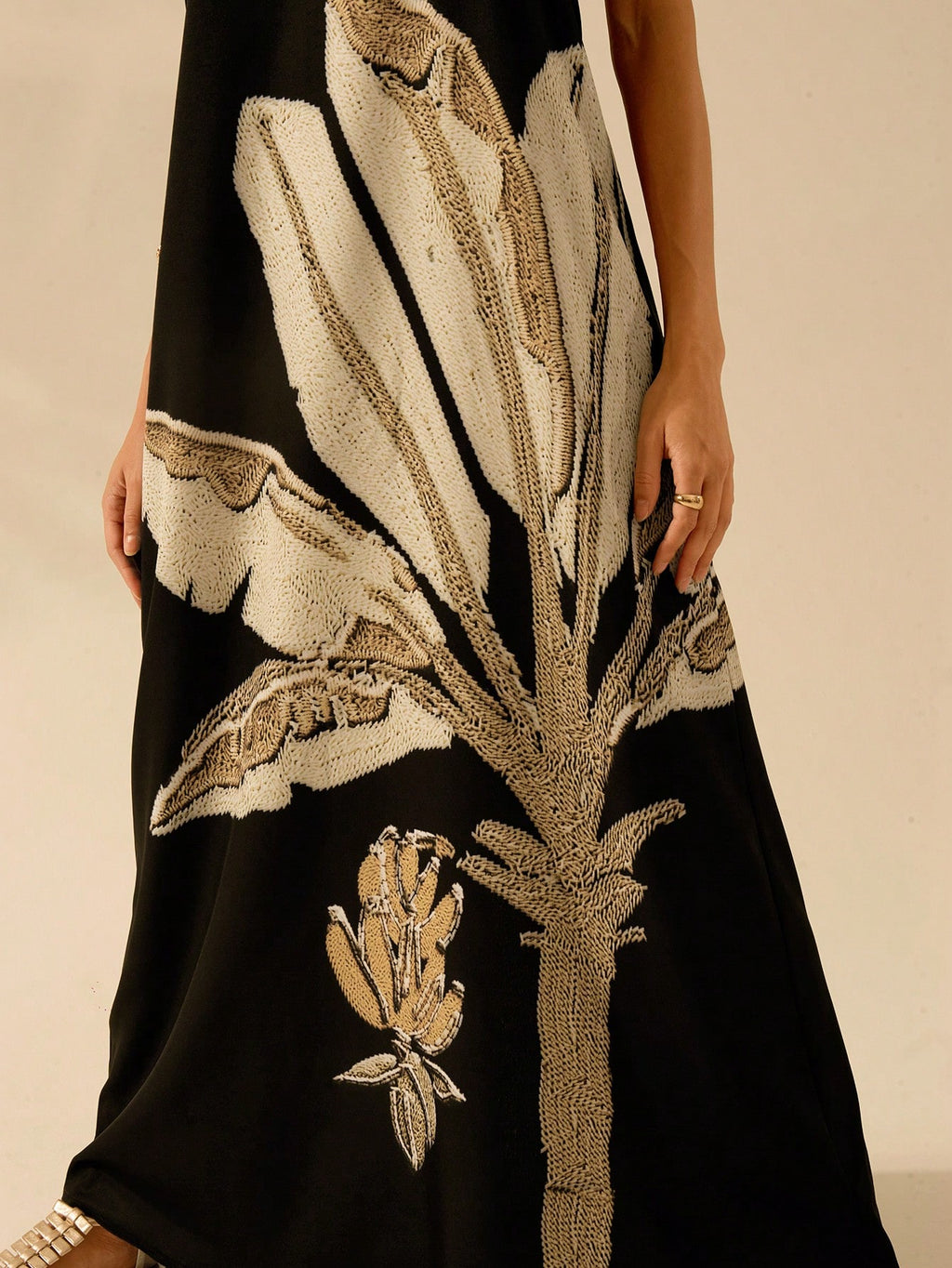 Sinta-se confiante e sofisticada com o Vestido Longo Preto com Estampa de Folhas Tropicais da Nelima Moda.