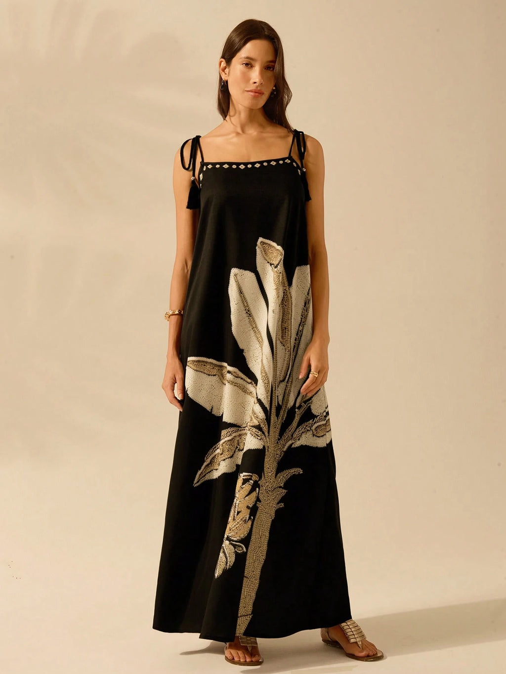 Vestido Longo Preto com Estampa de Folhas Tropicais – Elegância e Leveza Nelima Moda