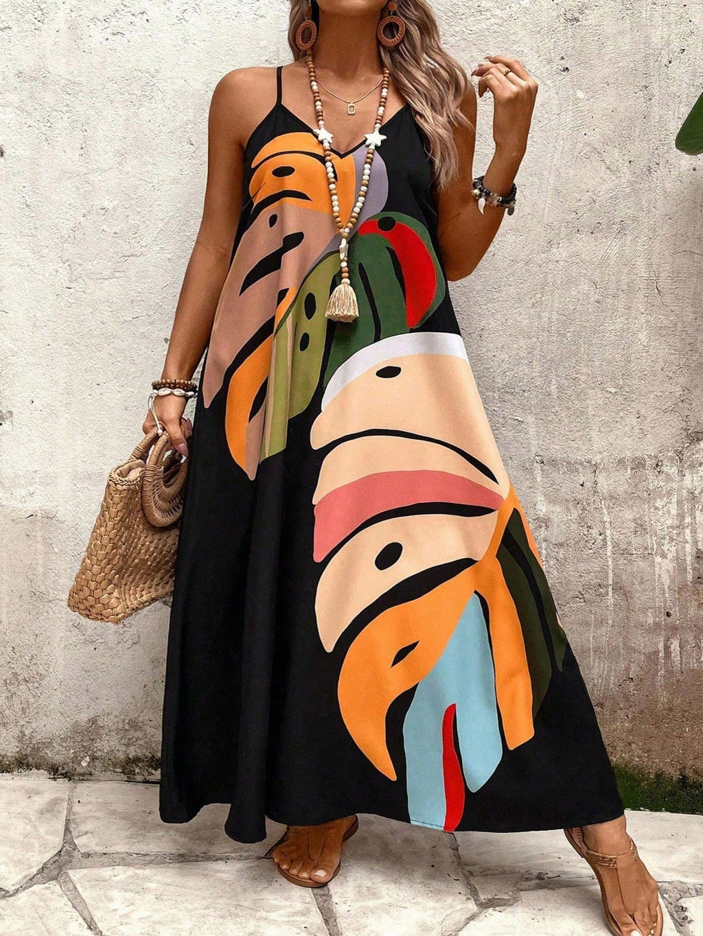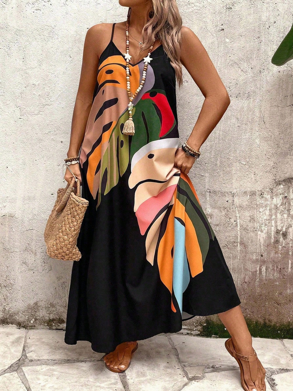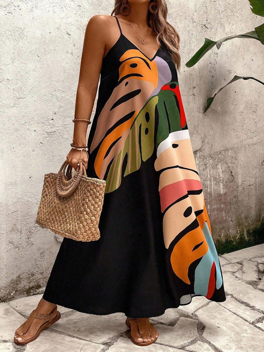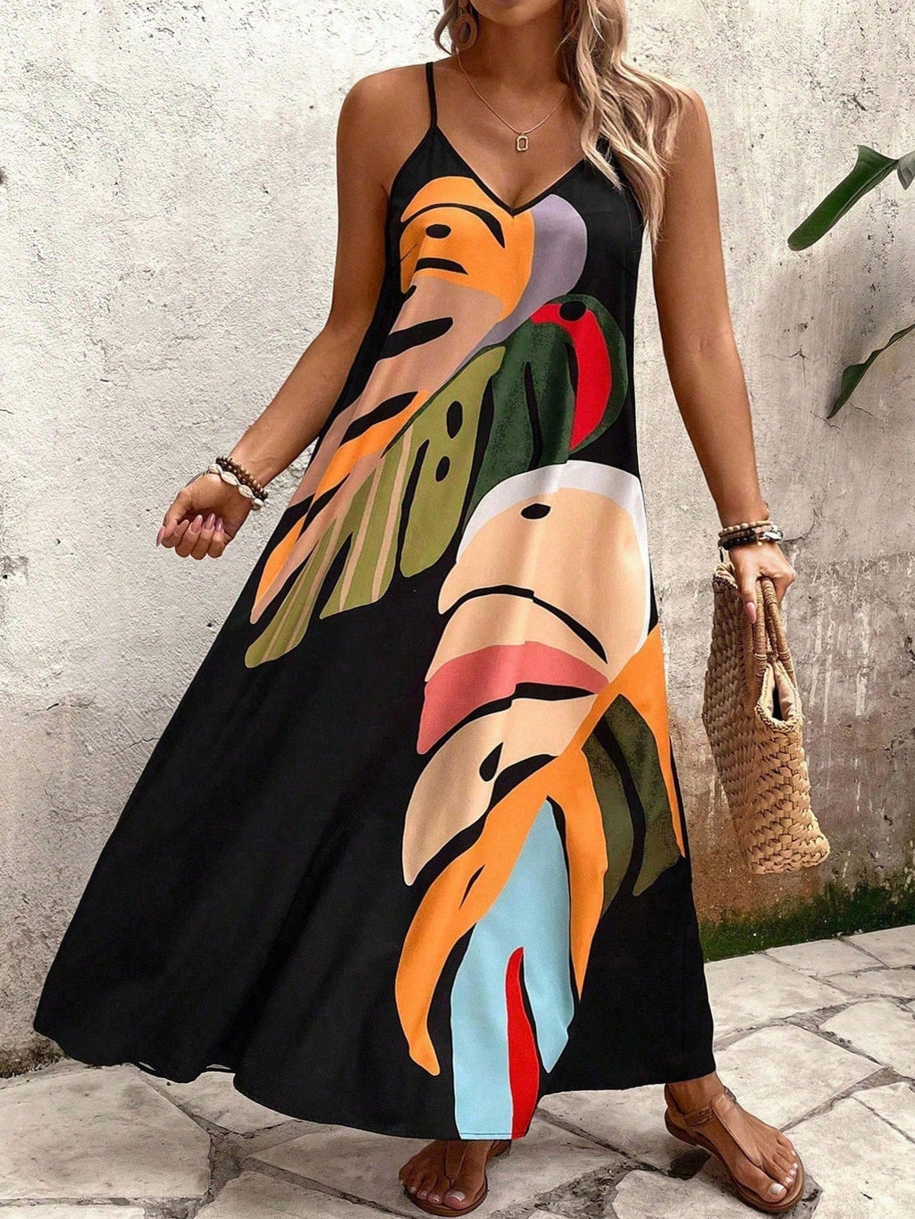 Vestido Longo Preto Estampado com Alças Finas – Elegância e Leveza Nelima Moda